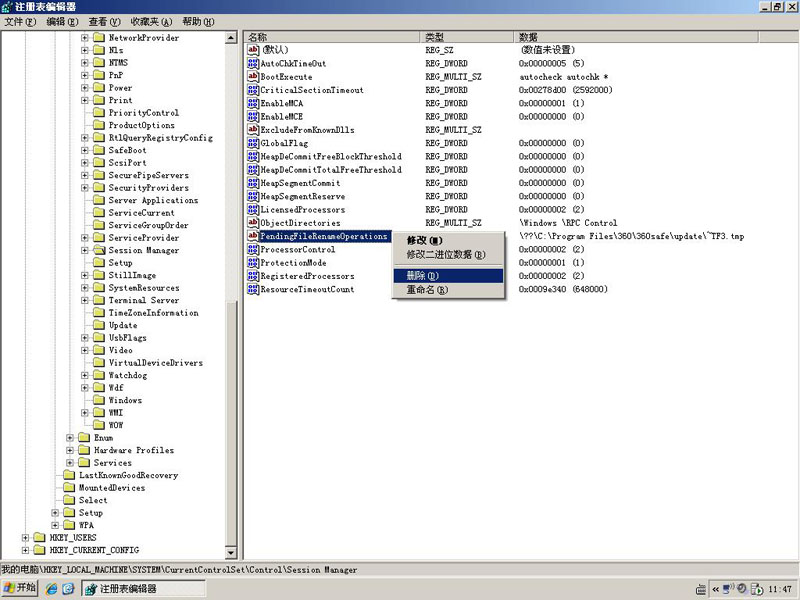 3、单击选中“Session Manager”,然后选择删除右边的“PendingFileRenameOperations”即可。如下图所示: