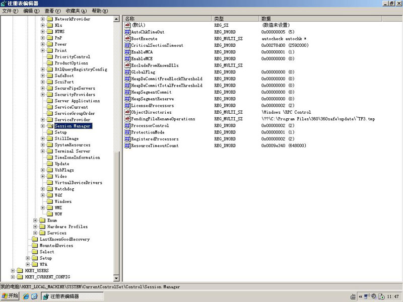 2、依次展开我的电脑(或者计算机)→ HKEY_LOCAL_MACHINE → SYSTEM → CurrentControlSet → Control→ Session Manager,如图:
