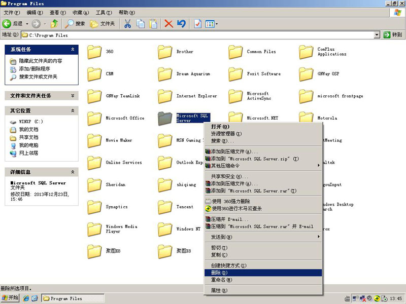 进入系统所在磁盘(默认为C盘),选择“Program Files”文件夹,选中并删除 Microsoft SQL Server 文件夹即可。