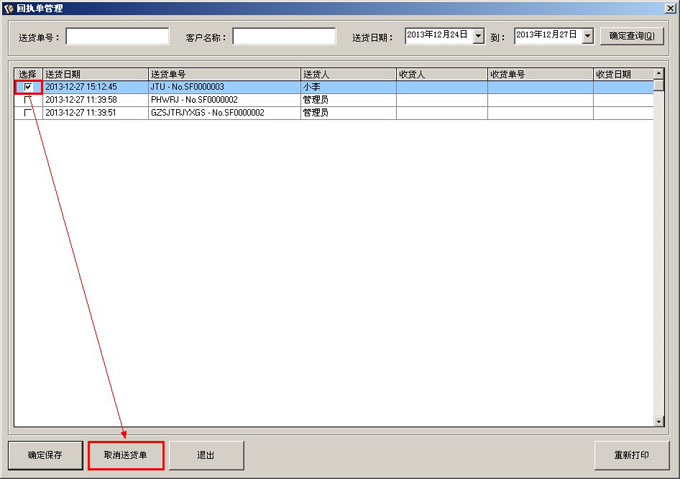 → 业务送货”中,选择“回执单”按钮