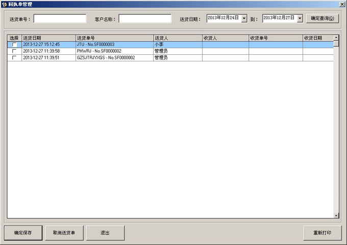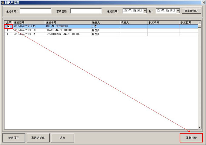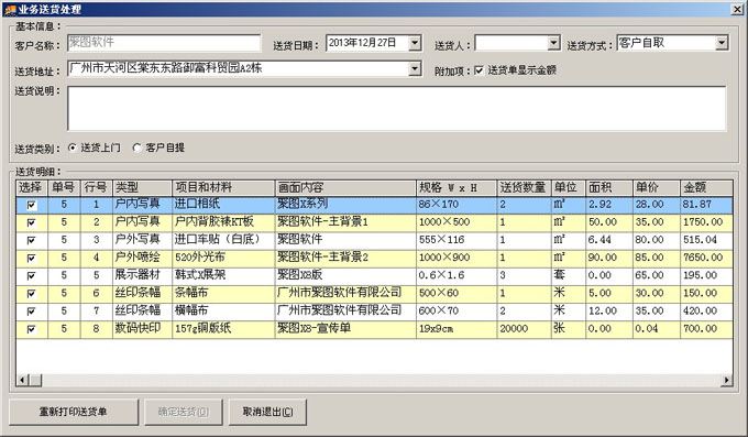 业务管理 → 业务送货中,单击“回执单”按钮,点击选择需要重新打印的送货单后,选择“重新打印”按钮即可,如下图: