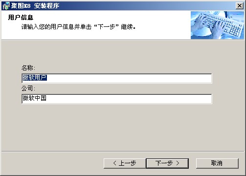 7、输入姓名和公司信息。亦可按其默认的,不改任何东西,直接选择“下一步”,如下图所示: